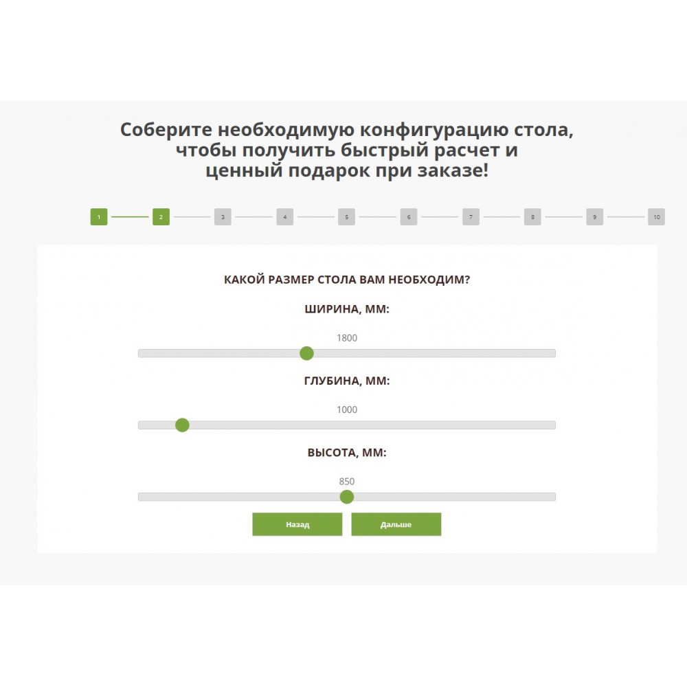 Квиз может быть оснащен любым количеством параметров - от возможности выбора размера, цвета и материала, до возможности сборки индивидуальной конфигурации с подбором дополнительных комплектующих.